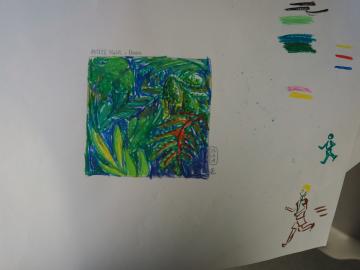 Ensuite vient Already Dead de Otzeki, des sonorités plus expérimentales s’emparent de la bibliothèque. Après l’écoute, les enfants captent l’essence de la chanson, les dessins sont plus abstraits mais très colorés !