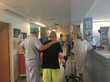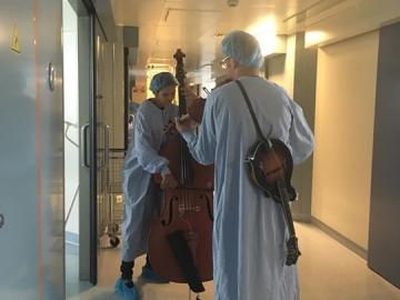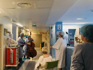 Dans les couloirs des soins continus, Joe & Agnès ont partagé quelques unes de leurs chansons. La contrebasse, la mandoline, le violon ont libéré de jolies notes... Les portes des chambres se sont peu à peu ouvertes, et quelques patients se sont rassemblés dans les couloirs, certains soignants agrémentaient même leurs soins de petits pas de danse, d'autres observaient tendrement la musique parcourir le service et ses habitants ponctuels..