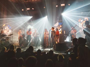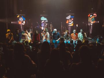 Sur scène, des couleurs, des formes suspendues, une jolie tribu de musiciens, musiciennes, artistes, chanteurs, danseurs, une joyeuse chorale hippie...! Certains petits et moins grands étaient absorbés, collés à la scène pour sentir au plus près la musique. D’autres couraient et dansaient d’un bout à l’autre de la salle et d’autres encore chantaient à tue-tête avec leurs familles.
