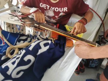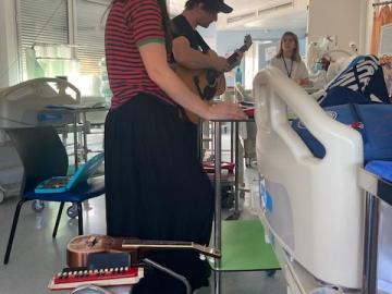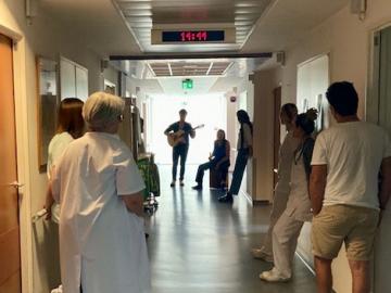 Quelle joie communicative sur les visages des enfants quand ils ont vu arriver les musiciens dans le service, les sourires et les yeux ont pétillé tout au long de l’après-midi ! Nous nous sommes laissés porter par l’enthousiasme des enfants et des soignants, tous et toutes ont essayé les instruments, composé quelques notes, écouté les chansons, posé des questions, et partagé des morceaux de leur vie, de leurs attentes. Une rencontre pas comme les autres, touchante de simplicité, d'humanité et de musique.