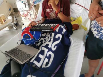 Avec l’équipe soignante déterminée et enthousiaste et la médiatrice culturelle du CHU, nous avons pensé plusieurs temps de rencontre et de création en musique à vivre dans le service avec les jeunes patients. Après plusieurs mois de réunions et d’autorisations administratives, en juillet, les artistes ont fait l’heureuse rencontre de Yanis et Aras !