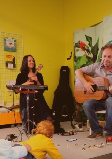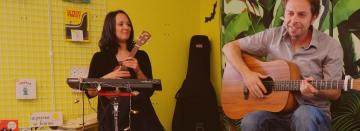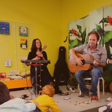 10h - Ouverture des portes (de la cantine-salle de concert). Les tout-petits et leurs doudous prennent place sur les chaises ou à côté ... Les premières notes de guitares entremêlées aux voix de Mike et de Ita fascinent le public !