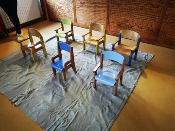 6 petites chaises sont déjà soigneusement installées sur un tapis, et petit à petit, la cantine de la crèche se transforme en mini-salle de concert ! Des étoiles lumineuses, quelques tableaux d'Ita...Les deux musiciens déplient leur scène "pour faire comme à la maison" avec petit peu de trac, de questionnements ...mais avec surtout une impatience joyeuse de rencontrer ce tout nouveau et si petit public !