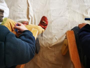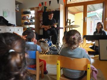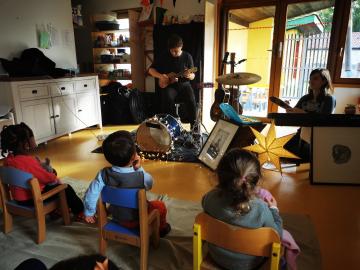 Les regards souriants et la belle humeur des professionnelles de la crèche nous acceuillent chaleureusement. Les tout-petits habitants observent, intrigués, ces allées et venues d'étuis, de housses de guitares, de sacs et de pieds de batterie qui traversent leur endroit.